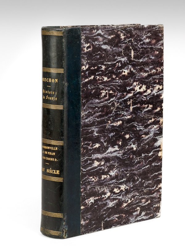 1 vol. grand in-8 reliure demi-basane noire, A. Desrez, Paris, 1838, XLVII-704 pp. Rappel du titre complet : Anonyme : Chronique de Du Guesclin ; Romances espagnoles et Limousine sur Blanche de Bourbon - D'Orronville : Chronique de Louis de Bourbon - Christine de Pisan : Vie de Charles V - Juvénal des Ursins : Chronique de Charles VI - Miguel del Verms : Chronique des Comtes de Foix en langue béarnaise - Anonyme : Chronique inédite de Flandres (Extrait des livres e Baudouin d'Avesnes) - G. Galan et M. de Rochefort : Ambassade au Juge d'Arborée [ Choix de Chroniques et Mémoires sur l'Histoire de France avec notices biographiques par J.A.C. Buchon ] Etat très satisfaisant (petit frott. à un mors, ancienne mouill. intérieure angulaire courant sur l'intégralité du volume, bon état par ailleurs, ex-libris gravé H. Noubel en garde) pour ce recueil peu commun.