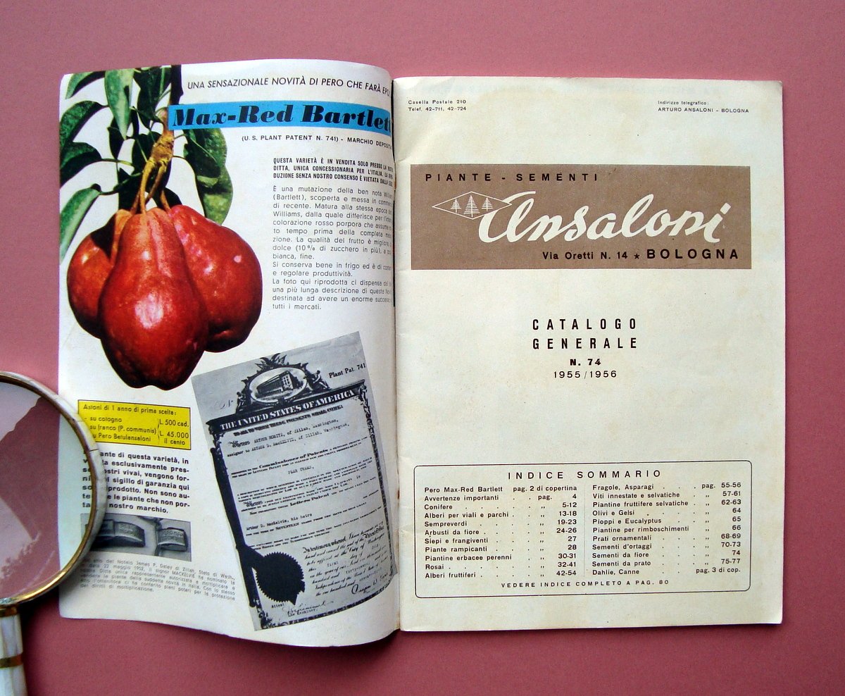 2 Cataloghi, Ansaloni Piante e Sementi Catalogo n.74 semestrale novembre 1955 Catalogo Generale Sementi N 82 primavera 1958 Bologna, 1955-56, 1958; cm 24x17 cad; pp. 77+32 con tavole a colori e molte ill. fot. colori e b/n; brossure ed. ill. a colori. Condizioni di conservazione Esemplari in buone condizioni con leggere tracce d'uso, br. del cat. n 82 con qualche piccola abrasione e piccolo forellino al margine inf., interni con leggere bruniture. OPEB.5430 blu