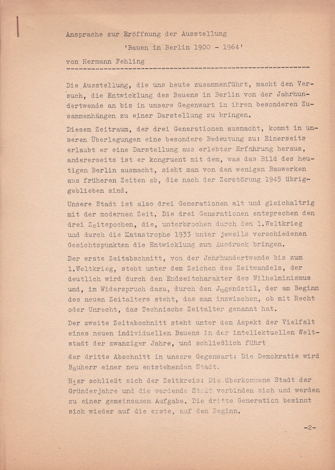 Ansprache zur Eröffnung der Ausstellung 'Bauen in Berlin 1900-1964'.