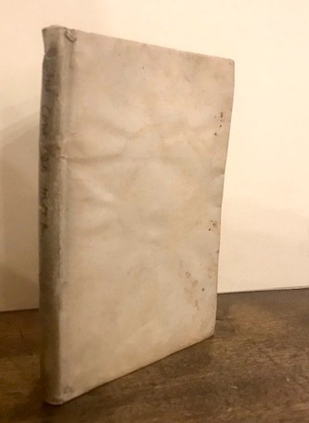 8vo (cm. 15,5), 8 cc.nn., 113(1) pp. Frontespizio in rosso e nero con bella marca tipografica. Ritratto dell’A. a piena pagina. Fregi e capilettera xilografici n.t. Legatura d’origine in pergamena floscia con titolo ms. al ds. Piccolo percorso di tarlo, ben lontano dal testo, al margine inferiore dell’intero volume. Pagine leggermente bruniture ma, nel complesso, esemplare in buono stato di conservazione. Rara edizione originale non censita da ICCU.