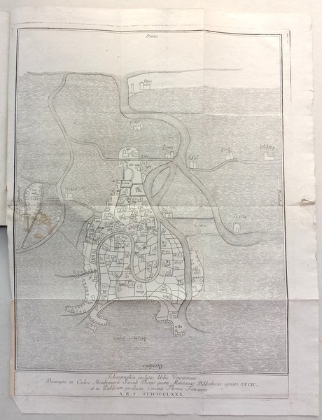 In-4 (27 cm) XII 95 (1) (1) c. (di tav. ripieg. Pianta) Vignetta su front. con motto: Amat victoria curam. Legatura ottocento-novecentesca, dorso in tela, piatti in cartoncino. Ottimo esemplare. Titolo completo "Antica pianta dell'inclita citta di Venezia delineata circa la meta del XII secolo, ed ora per la prima volta pubblicata, ed illustrata. Dissertazione topografico-storico-critica di Tommaso Temanza architetto, ed ingegnere della serenissima repubblica di Venezia Socio onorario delle due Reali Accademie di Parigi, e di Tolosa in Francia; ed in Italia della Clementina di Bologna, e della Olimpica di Vicenza. L'immagine fu scoperta, incisa su lastra di rame, pubblicata, e commentata per la prima volta nel 1781 dall'architetto Tommaso Temanza, il quale riteneva che la matrice del disegno fosse riconducibile al XII secolo. La pianta rappresenta la città con l'est verso l'alto, in cui sono simbolicamente raffigurate le chiese indicate con i rispettivi toponimi ed è la copia, incisa dallo stesso Temanza, di una carta manoscritta su pergamena che sta in: "Chronicon a mundi initio ad annum.", del sec. XIV, conservato alla Biblioteca Marciana. Temanza Tommaso (1705-1789) fu un famoso architetto, ingegnere idraulico e scrittore veneziano. Ricoprì la carica di proto del Magistrato alle Acque; costrui diversi a Venezia e a Padova, tra cui il totale rifacimento della chiesa della Maddalena a Cannaregio, con chiari elementi simbolici alla Massoneria, cui probabilmente il Temanza apparteneva. Cicogna 4514. Marinelli, 1881, n. 1225; Cassini, 1971, n. 90; Biadene, 1982, n. 90. Romchese, Supernova 2005. (EN) In-4 (27 cm) XII 95 (1) (1) c. (of table plan) Vignette on front. with motto: Amat victoria curam. Nineteenth-twentieth century binding, canvas spine, cardboard plates. Excellent example. Full title "Ancient plan of the famous city of Venice outlined around the middle of the 12th century, and now published and illustrated for the first time. Topographical-historical-critical dissertation by Tommaso Temanza architect and engineer of the Serenissima republic of Venice Honorary member of the two Royal Academies of Paris, and of Toulouse in France; and in Italy of the Clementina of Bologna, and of the Olimpica of Vicenza. The image was discovered, engraved on a copper plate, published and commented on for the first time in 1781. architect Tommaso Temanza, who believed that the matrix of the drawing was attributable to the 12th century. The plan represents the city with the east facing upwards, in which the churches indicated with their respective toponyms are symbolically depicted and is the copy, engraved by Temanza himself, of a manuscript paper on parchment which is in: "Chronicon a mundi initio ad annum.", from the 14th century, preserved in the Marciana Library. Tommaso Temanza (1705-1789) was a famous architect and engineer Venetian plumber and writer. He held the position of proto of the Water Magistrate; built several in Venice and Padua, including the total renovation of the Maddalena church in Cannaregio, with clear symbolic elements of Freemasonry, to which Temanza probably belonged. Stork 4514. Marinelli, 1881, n. 1225; Cassini, 1971, n. 90; Biadene, 1982, n. 90. Romchese, Supernova 2005.