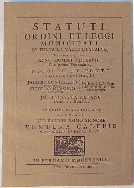 Antica Repubblica di Scalve. Breve sintesi della sua storia, delle sue leggi e costumi. (In cofanetto con la ristampa anastatica della edizione del 1733 degli Statuti)