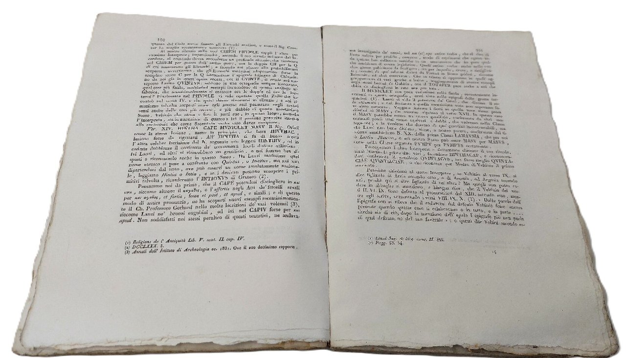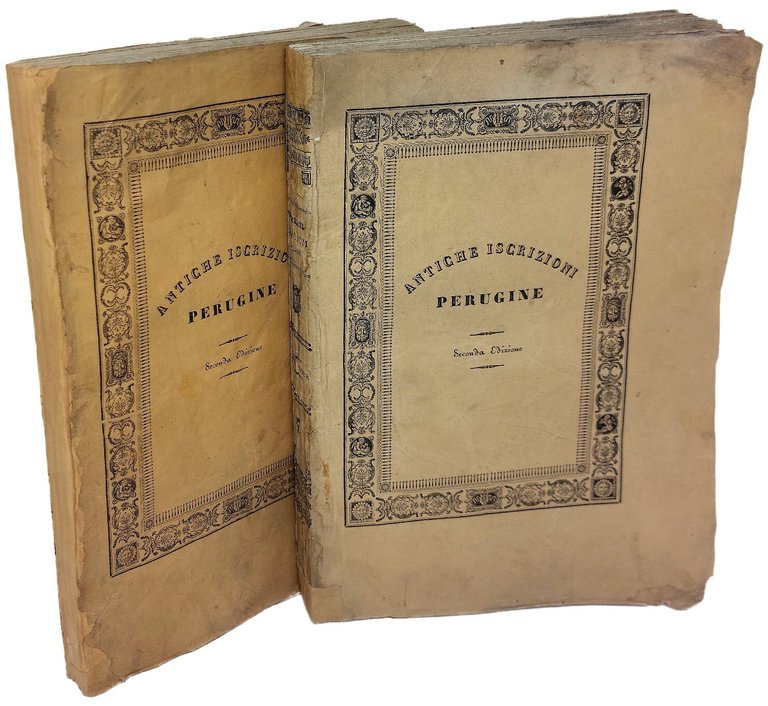 >2 vol. in-4, pp. XXXII, 676 (numeraz. continuata), broch. edit. con bordura silografica sulle copertine. Antichi restauri ai dorsi (quello del II vol. è muto). Con tabella sinottica ripieg. f.t., una tavola inc. inserita davanti a pag. 85 e 8 tav. inc. al tratto in fine f.t. ll primo vol. è dedicato alle iscrizioni etrusche, il secondo a quelle latine. Fondamentale vasto lavoro d'interesse storico-archeologico sulle centinaia d'iscrizioni etrusco-romane di Perugia e del suo circondario, di alcune delle quali viene riprodotto il testo. Elegantemente impresso su carta grande. Esemplare a pieni margini, con alcuni aloni d'umido limitati alle prime ed ultime pagine del I vol. Manca a Lozzi. Cat. Platneriana p. 260 e Cicognara n. 3151 (entrambi registrano la prima ediz. 1804).