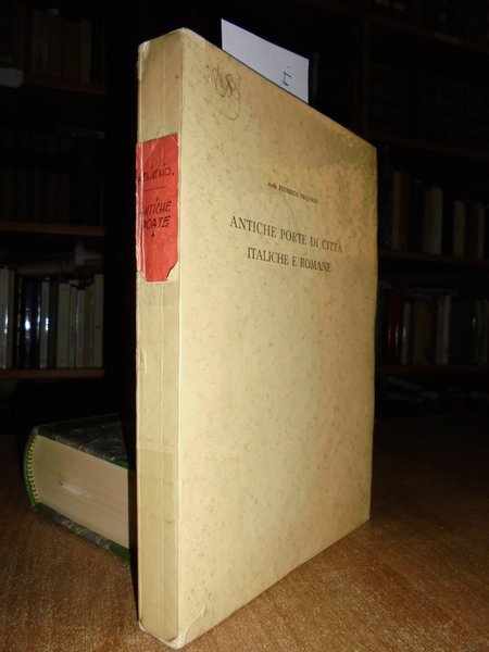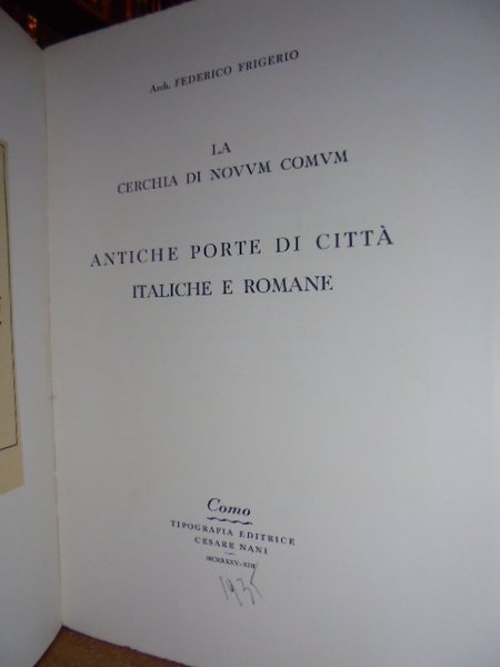 Arch. Federico, Frigerio. Como, Tipografia Editrice Cesare Nani, 1935. In-8° grande, cart. edit con titolo al piatto. 287 pp. con 226 illustrazioni in bianco e nero n.t. e XIII tavole più volte ripiegate fuori testo raffiguranti antiche porte, siti, scavi, particolari delle porte antiche delle città italiane ed Europee. 13 tavole più volte ripiegate con disegni, immagini e piantine. Dall'indice: La cerchia di Como Romana - Le antiche Porte Urbane - Le Porte dell'Impero (I° sec. II° sec. III° sec). Invio autografo dell' Autore ad un amico nella prima bianca. Al verso una illustrazione applicata. Esemplare raro e ben conservato. Neg. mob. 4
