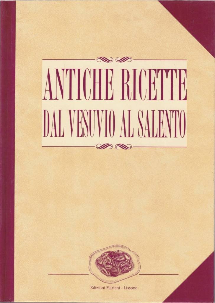 Antiche ricette dal Vesuvio al Salento, ideazione Pierangelo Mauri, Edizioni Mariani, Lissone (Milano) 1992, pp. 122, ill. b. n., cm 25, cart. ed. con titoli al dorso e al piatto. Bel volume di ricette tipiche dell’Italia meridionale stampato su carta paglia e riccamente illustrato. Edizione fuori commercio realizzata per Generale Supermercati. (GS). Perfetto.