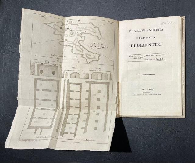 Firenze, Nella Stamperia di Borgo Ognissanti, 1809. Dedica “Al Signor Cavaliere Gio. Gherardo De Rossi Romano. Tra gli Arcadi Perinto Sceo, ed Accademico di Onore dell'Insigne Accademia di S. Luca in Roma. In fine alla pubblicazione: “Estratta dal Vol. XI della Collezioni d'Opuscoli Scientifici e Letterarj che si stampa in Firenze”. In 8vo piccolo, cm 14 x 22 (alla legatura), bross. amatoriale recente con titolo manoscritto al piatto. A inizio volume, davanti al frontespizio, è presente una cartina ripiegata, realizzata su disegno dell'Ingegner Gio. Grazzini. In alto essa illustra la forma dell'isola con le coordinate di orientamento e la posizione topografica delle antiche fabbriche di Giannutri; più in basso, quattro piante di antichi edifizi che il Grazzini ritiene essere i resti di strutture per la conserva dell'acqua o di un tempio risalente a epoca romana. Si tratta della prima originale pubblicazione sull'Isola di Giannutri, sita a sud dell'Arcipelago toscano. Rarissima. Stampato su bella carta forte e ottimamente conservato.