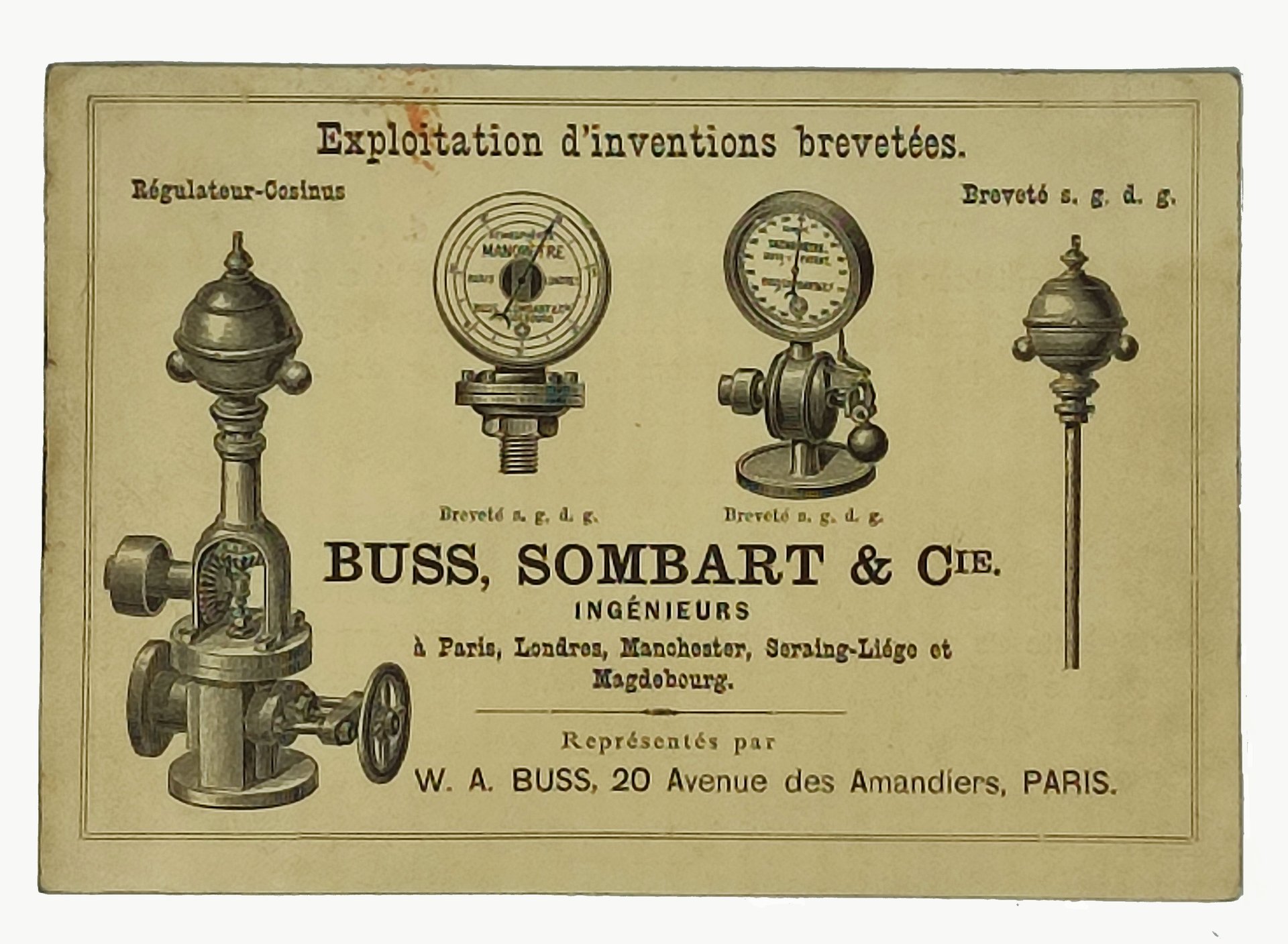ANTICO CARTONCINO PUBBLICITARIO ILLUSTRATO della ditta BUSS, SOMBART & Cie Ingenieurs