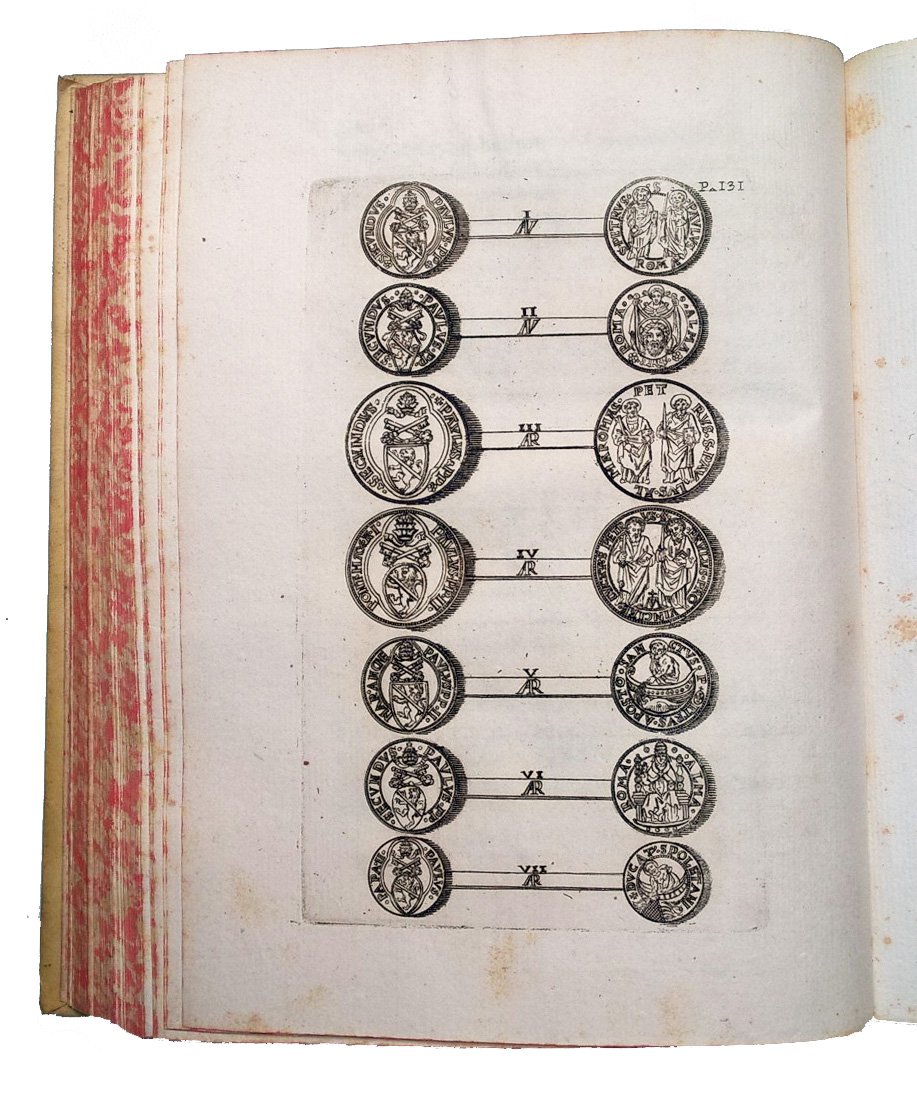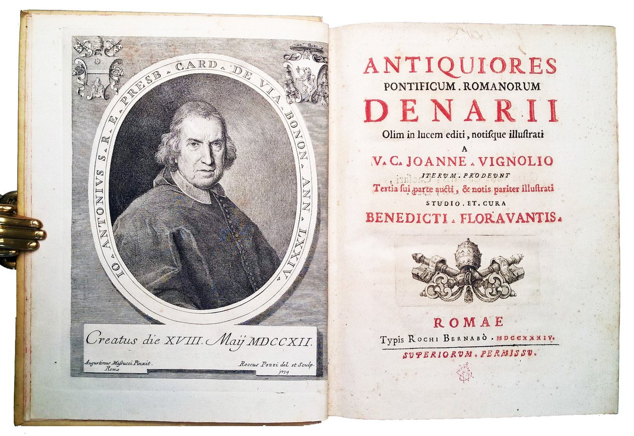 Antiquiores pontificum Romanorum denarii olim in lucem editi, notisque illustrati a v.c. Joanne Vignolio iterum prodeunt tertia sui parte aucti, & notis pariter illustrati studio et cura Benedicti Floravantis (1.) - (Segue, del medesimo autore, 2.:) Antiqui Romanorum pontificum denarii a Benedicto 11. ad Paulum 3. Una cum nummis S.P.Q.R. nomine signatis nunc primum prodeunt notis illustrati A. Benedicto ab Florauante