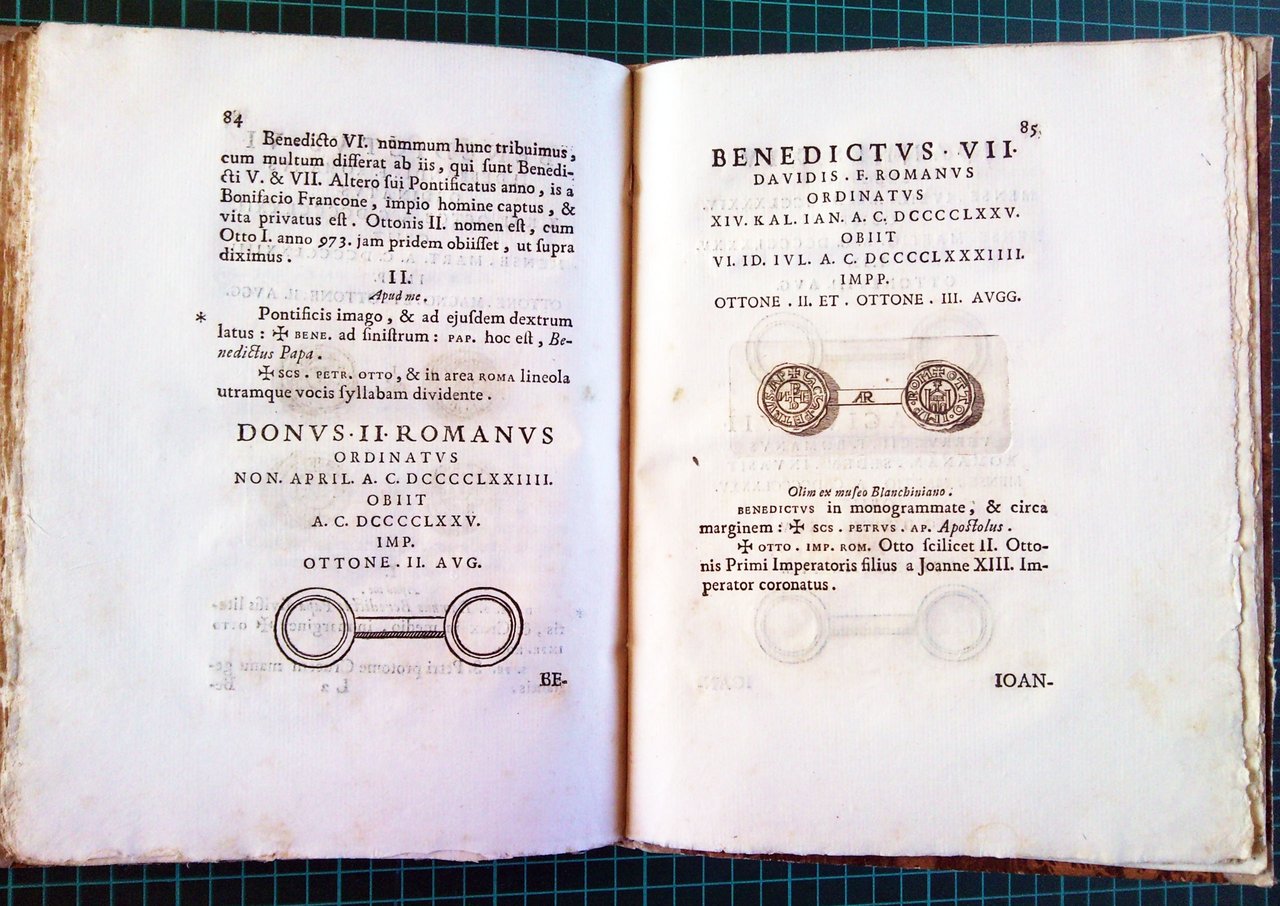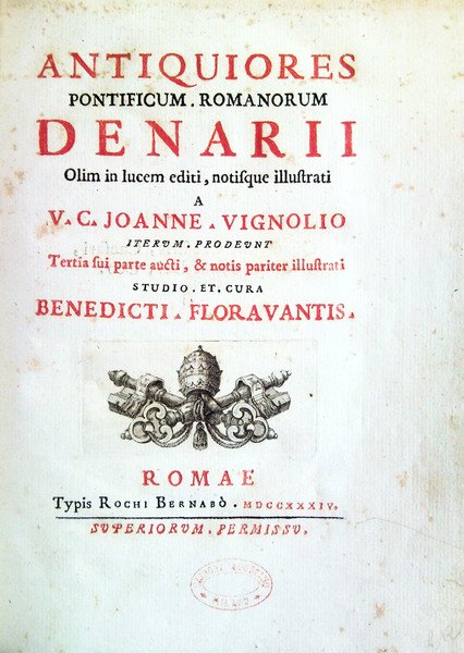 Antiquiores pontificum romanorum denarii olim in lucem editi, notisque illustrati a V.C. Joanne Vignolio (…), & notis pariter illustrati studio et cura Benedicti Floravantis.