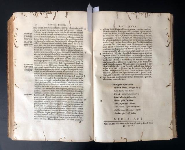 Senza indicazioni editoriali per mancanza del frontespizio ma edizione seicentina (dopo la pagina 326 si legge “Die 23 Augusti 1623”). In 4to, tre parti in unico volume, pp. 326; 139; 40 (più una di Index Capitum). Trattasi di esemplare da studio dove purtroppo sono state ritagliati tutti i capolettera (presenti invece testatine e finalini) e con ampi lavori di tarlo lungo i margini bianchi, specie al superiore. Laddove non siano appunto i riquadri ritagliati, il testo, stampato a grandi lettere e con postille corsive a lato, risulta molto marginoso e perfettamente leggibile, anche perché stampato su ottima carta che si è conservata fresca e pulita. Legatura originale in piena pelle rossa con usura marginale e alcune lievi abrasioni, ricche impressioni oro, tagli oro su tutti i lati. Giorgio Merula, nato Giorgio Merlani di Negro (Alessandria, 1430 – Milano, 1494), nome umanistico Georgius Merula Alexandrinus, è stato un filologo, storico e umanista italiano. Il suo percorso conobbe il più alto livello culturale dell’epoca e i suoi lavori furono sempre caratterizzati da una forte impronta filologico grammaticale. Ludovico il Moro incaricò il Merula di redigere una storia della Famiglia Visconti (“Antiquitates Vicecomitum “ o “Historia Vicecomitum”) e fu così che nacque questa importante raccolta di opere storiche sulla città di Milano. Merula ricevette anche il permesso di consultare la biblioteca e l'archivio visconteo di Pavia ma ciò nonostante non completò mai l’opera, fermandosi invece alla Battaglia di Parabiago del 1339, ossia più di cent'anni prima che la dinastia dei Visconti si estinguesse con Filippo Maria, nel 1447. Merula però consultò la “Commedia” di Dante, cercando di indagare, a partire dai versi 73 - 75 del canto VIII del Purgatorio, l'identità della sposa di Galeazzo I Visconti, Beatrice d’Este, e i motivi della aspra critica che il sommo poeta avanzò nei confronti del signore di Milano. .