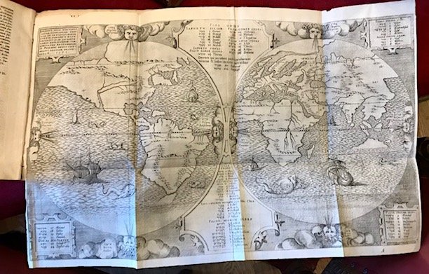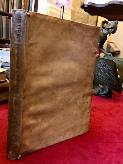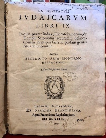 4to (cm. 24), 2 cc.nn., 200 pp. Con 16 tavv. calcografiche f.t. (tutte più volte ripiegate) ed una illustrazione n.t. a p. 126. Marca editoriale al frontespizio. Capilettera xilografici. Testo su due colonne. Legatura coeva in pergamena floscia con tracce di legacci e titolo ms. in verticale al ds. (leggermente allentata e con qualche minuscola mancanza marginale). Antiche firmette di appartenenza al frontespizio ’Ex haereditatu domini Ludovici Cadurij.’ e ‘J. Baduc’. Ex libris araldici al contropiatto anteriore, ’Pellissier de Feligonde’ e ‘Chateau de la Varvasse’. Tagli ad alcune tavole, più rilevante quello sull’ultima, tuttavia senza alcuna mancanza. Nel complesso, esemplare molto genuino ed in ottimo stato di conservazione. Prima edizione di questa raccolta di nove trattati sulle antichità ebraiche dell’orientalista, esegeta e umanista andaluso Arias Montano (1527-1598) estratti dalla celebre Bibbia poliglotta di Anversa di cui egli stesso diresse la pubblicazione tra il 1568 ed il 1572. Uno dei rarissimi esemplari conosciuti completo delle 16 tavole previste: le due copie descritte da Adams (M-1630) ne contengono rispettivamente soltanto dodici e quindici. Le tavole raffigurano piante, vedute, scene dall’Antico Testamento, carte geografiche (tra cui il meraviglioso mappamondo datato sulla lastra 1571, cfr. Shirley n. 125). Quattro sono firmate con il monogramma di Pieter Huys ed una con quello di Joannes Wiericx. Cfr. anche Palau, 16496.