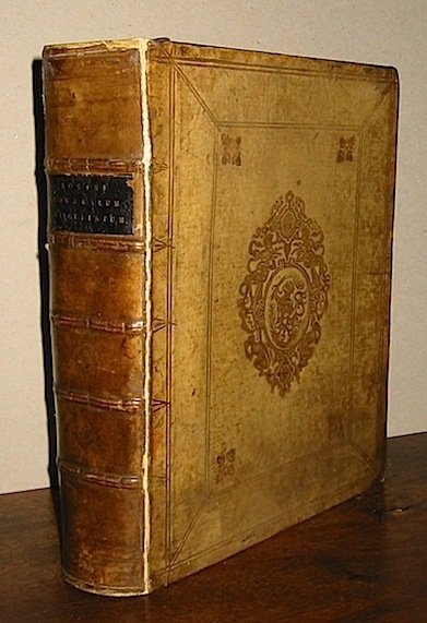 4to (cm. 24,2), 8 cc.nn. (compresa bella antiporta interamente incisa su rame e frontis.), 956 pp., 14 cc.nn. con 8 tavv. f.t. (tra cui una grande pianta di Roma antica più volte rip.). Legatura coeva in piena pergamena, piatti con cornici a secco e grande stemma in oro impresso al centro. Dorso a nervi (restaurato anticamente con applicazione della pergamena antica su supporto interno) fregi e titolo oro su tassello in pelle scura. Cerniere restaurate e capitelli leggermente allentati. Un angolo del piatto posteriore usurato. Interni in ottime condizioni. Nel complesso attraente esemplare. Rossetti,8921.