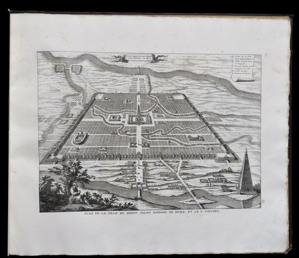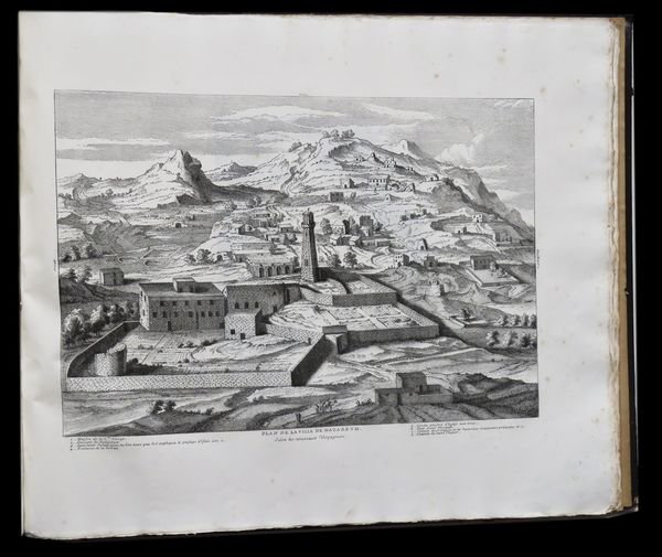 In folio oblungo (55,5x47 cm); (42) cc. nn. Legatura coeva editoriale in mezza tela verde con titolo e fregio impreso in oro al piatto anteriore. Una piccolissima ed ininfluente mancanza di carta al margine esterno alto di carta 17. Qualche macchiolina di foxing, più intense al frontespizio ed alle prime pagine, dovute alla qualità della carta, alcuni piccoli forellini al margine bianco basso delle prime due carte, ininfluente e per il resto in buone condizioni di conservazione. Esemplare ancora in barbe. Lopera vene stampata su carta forte. Prima rara e completa edizione, ancor più rara a reperirsi completa dei piatti originali, di questo interessante studio illustrato dedicato alla storia, allarcheologia, ai costumi, festività ed ai monumenti degli ebrei e della terra di Israele. Il volume presenta 23 magnifiche e grandi tavole che riproducono templi , planimetrie, monumenti e avvenimenti legati alla storia del popolo ebraico. Il volume si apre con la storia di Mosè. Seguono poi capitoli dedicati a: Il tempio di Gerusalemme, Salomone, Le Sanhedrin, Ville de Ninive, Tombeau de Rachel, Le Sabbat, La Paque, Rejouissances et Festins des Juits pendant la fete des Tabernacles, Repudation, Divorce, Ville de Nazareth, Ceremonie du Mariage de la Sainte Vierge, Formule des contrats de Mariage des Hebreux, Transfiguration de N.=S. sur le Mont=Thabor, Sepulcre ou Tombeau de N. =S. Jesus=Christ, Montaigne des Oliviers, Explication de quelques Monnaies et medailles des Juifs (con tavola delle monete). Alla fine del volume tavola cronologica della lista cronologica dei Re dei Liste Chronologique des Rois des Hebreux, les israelites nont commence a avoir des Rois que depuis Saul, Rois de Juda, Rois dIsrael, Listes de s Macchabees, ou des PrincesAsmonees qui ont Gouverne la Republique des Juifs en qualite de Princes et de Grands Pretres Jusquau regne dHerodote le Grand, Liste Chronologique des Grands Pretres des Hebreux, Table chronologique de lHistoire de la creatione du Monde. Le ultime quattro pagine sono infine dedicate alla spiegazione del calendario ebraico. Opera molto rara ed ancora in barbe. Le tavole illustrate sono opera di Aveline, Scotie ed altri.