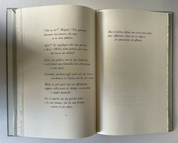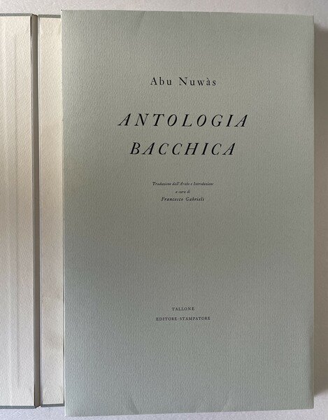 34 x 22 cm. 71 p. Brossura con carta in barbe in cofanetto editoriale in cartone muto. Volume in perfetto stato. Prima edizione. Tiratura limitata, la copia presente è la n. 305; traduzione dall’arabo e introduzione a cura di Francesco Gabrieli