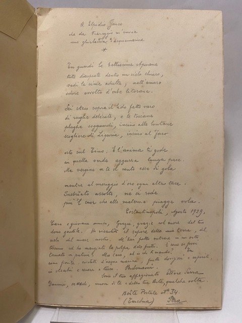 Brossura in carta di pregio con unghiatura risvoltata a tamburo, edizione di 82 esemplari di cui 12 in carta di pregio, xilografie nel testo di Francesco Gamba, marca editoriale di Adolfo De Carolis, ottima copia con una pagina interamente manoscritta con una poesia inedita di Serra e altri scritti da Costantinopoli dedicati a Elpidio Jenco, allegata anche una lettera autografa a Elpidio Jenco datata 1937. Curioso il titolo dell’opera: Antologia breve degli scritti postumi, Serra in realtà nel 1929 era vivo e sarebbe morto soltanto nel 1980.