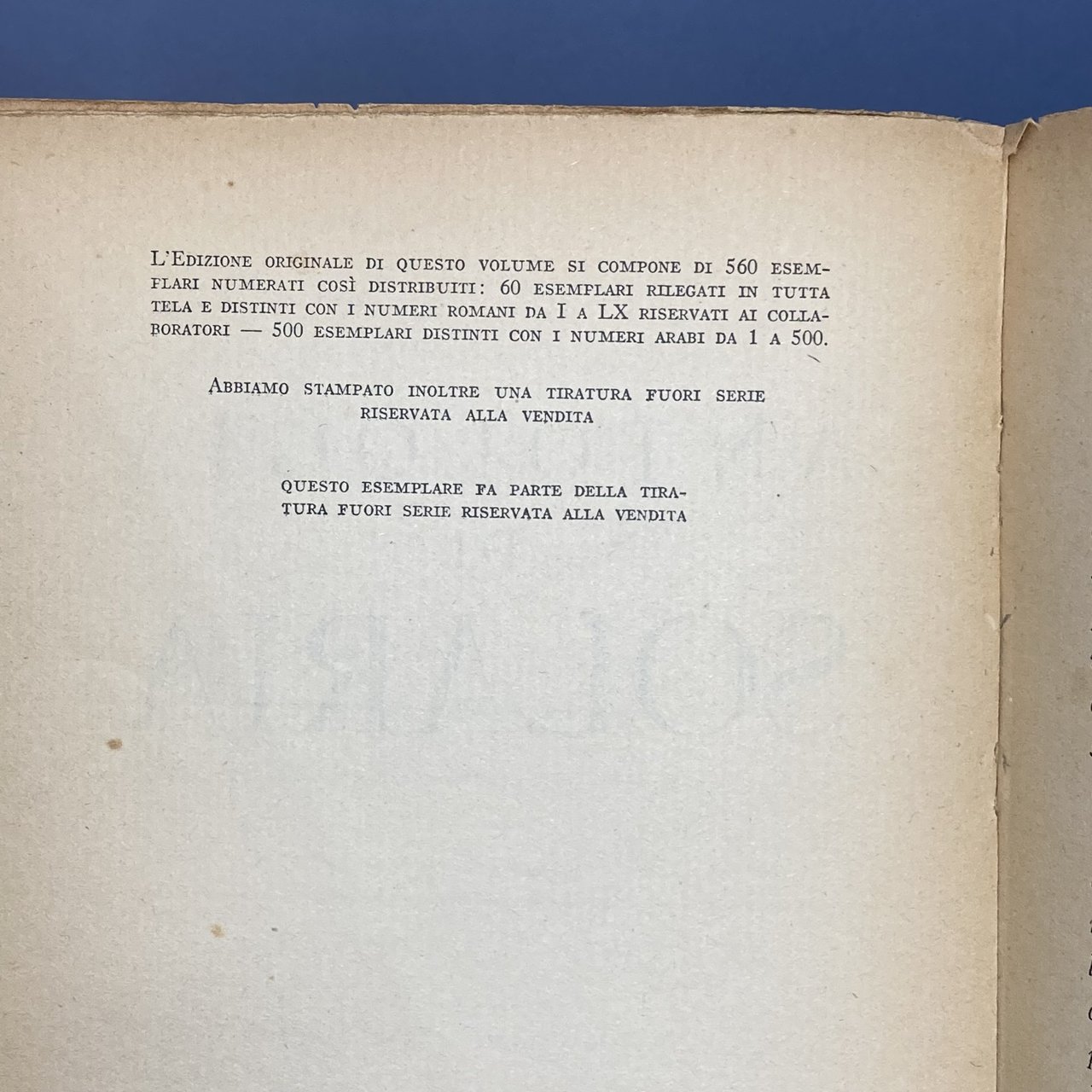 8°, cm 21, brossura editoriale su carta vergellata con titoli in rosso e nero al piatto e al dorso. Edizione originale. Tiratura di 60 esemplari numerati con numeri romani, 500 esemplari numerati con numeri arabi e una tiratura fuori serie riservata alla vendita. Nostro non numerato. Buona copia. Unghiature sgualcite, leggero ingiallimento della copertina.. *** TUTTI I NOSTRI LIBRI SONO VISIBILI PREVIO CONTATTO MAIL O TELEFONO NELLA NUOVA SEDE DI MILANO: LIBRERIA COSMOPOLIS, VIA JOMMELLI, 22. ***