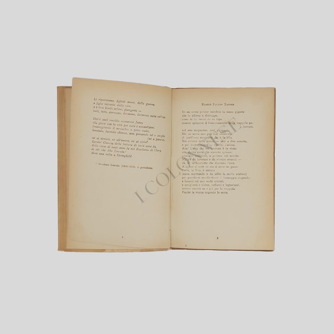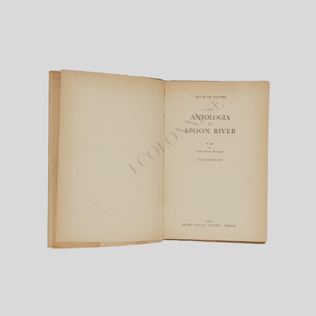 In-16 (cm 18), pp. 154(2). A cura di Fernanda Pivano. Copertina editoriale, illustrata di Francesco Menzio, ideatore anche dell’impaginazione. Rara da trovarsi completa della carta pelleaglio editoriale con titolo in rosso: una grande voce americana. Lievi bruniture alla copertina, ma in buone condizioni. (Collana Universale Einaudi, 13). Seconda edizione italiana. «Il presente volumetto è una scelta dalla prima Spoon River Anthology, condotta secondo un criterio meno di documento che di poesia. Si è cercato di conservare nella versione il nudo ritmo epigrafico del testo» (dalla Prefazione di Fernanda Pivano). L’antologia fu scoperta da Cesare Pavese. La prima edizione italiana, con la traduzione di Fernanda Pivano, apparve nell’aprile del 1943, venne immediatamente sequestrata dal regime fascista, con la scusa che la copertina fosse indecente, e la Pivano fu imprigionata. Il libro fu rimesso in circolazione nell’agosto dello stesso anno, pochi giorni prima dell’armistizio. Il nostro esemplare apparve in seconda edizione, conforme alla prima, all’indomani della Liberazione. MASTERS Edgar Lee (Garnett, Kansas 1869 – Melrose Park, Pennsylvania 1950). Avvocato e poeta, esordì con A book of verses (1898), cui fece seguire altri scritti poetici e drammatici di genere tradizionale. Salì improvvisamente alla fama quando, ispirandosi ai tipi umani osservati nei tribunali e sull’esempio dell’Antologia greca, pubblicò, prima sul Mirror, poi in volume (The Spoon River anthology, 1915, seguita l’anno successivo da una versione definitiva arricchita di 35 componimenti), una serie di epitaffi composti in uno stile lirico-satirico assai originale, in cui si confessano i defunti sepolti nel cimitero d’un piccolo paese nel centro degli Stati Uniti. Il successo del volume fu straordinario, con esso M. metteva a nudo l’ipocrisia puritana del mondo provinciale americano. Nel 1924 pubblicò una nuova serie, The new Spoon River anthology, che, se non uguaglia la felicità della prima, le è assai prossima [Cfr. www.treccani.it].