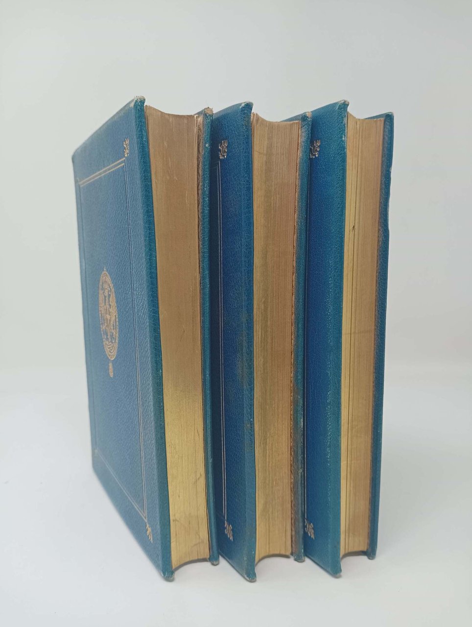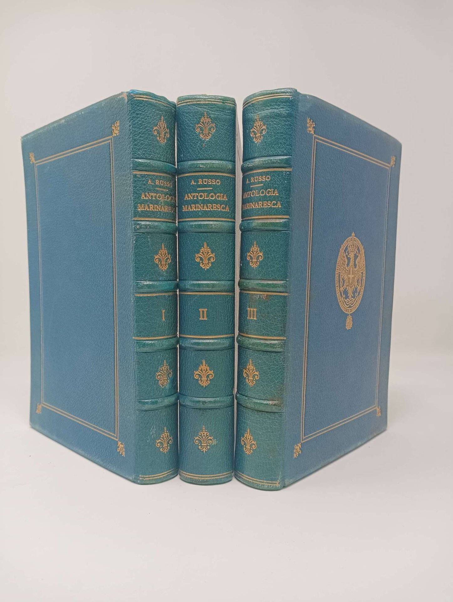 >3 volumi in-8 (mm190x120), pp. X, 479; 466, 496. Bella legatura in pieno marocchino blu ornato da bordura a filetti oro ai piatti, dorsi a nervi con fregi oro, tagli dorati. Sul piatto anteriore dei tre tomi è impresso in oro lo stemma araldico di Vittorio Emanuele III di Savoia Re d'Italia. Esemplare assai bello di importante e vasto trattato su ogni aspetto letterario, biografico e storico di Marina nei secoli.