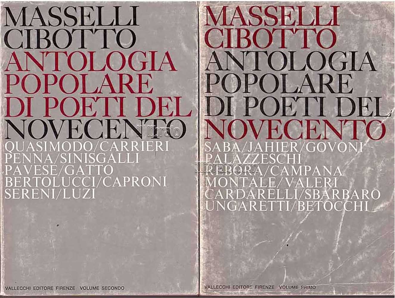 2 voll.; in 16°; pp. 284, 224; br. con sovracop. Volume I: Saba, Jahier, Govoni, Palazzeschi, Rebora, Campana, Montale, Valeri, Cardarelli, Sbarbaro, Ungaretti e Betocchi. Vol. II: Quasimodo, Carrieri, Penna, Sinisgalli, Pavese, Gatto, Bertolucci, Caproni, Sereni e Luzi.