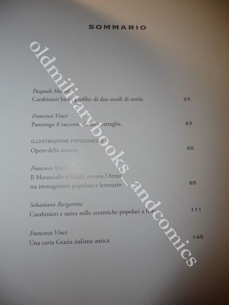 DESCRIZIONE: Casa Editrice Nuova Tavolozza Palermo 2000, br. ed. ill. pp. 157 vol. completamente ill. principalmente a col. e b/n, in 4°. Riproduzione di documenti storici, foto in b/n, bronzi con tema Arma, riproduzioni di tavole uniformologiche, notevole apparato fotografico su uniformi, accessori elmi etc., i Carabinieri nell'arte popolare. Bello. CONDIZIONI: Discrete/Buone, purtroppo il vol. al retro di cop. presenta una piega che la interessa tutta. PESO / WEIGHT: 968 gr. without package