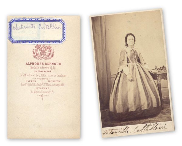 Antonietta Coltellini (Modena). Attrice drammatica. Figlia dell'impresario teatrale F. Coltellini. Foto all'albumina del 1870 circa con autografo. Fotografia dello studio Alphonse Bernoud.