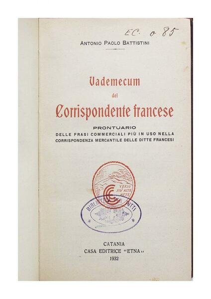 Autore: Antonio Paolo Battistini Titolo: Vademecum del Corrispondente Francese Sottotitolo: Prontuario delle frasi commerciali più in uso nella corrispondenza mercantile delle ditte francesi. Edizione: Catania casa editrice "Etna" 1932 Dimensioni: 11 x 17 cm c.a. Pagine: 215 Copertina: Brossura Condizioni: Ottime come da foto