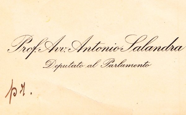 *Antonio Salandra. (Troia, 1853 – Roma, 1931). Politico italiano, Presidente del Consiglio dei ministri. Biglietto da visita.
