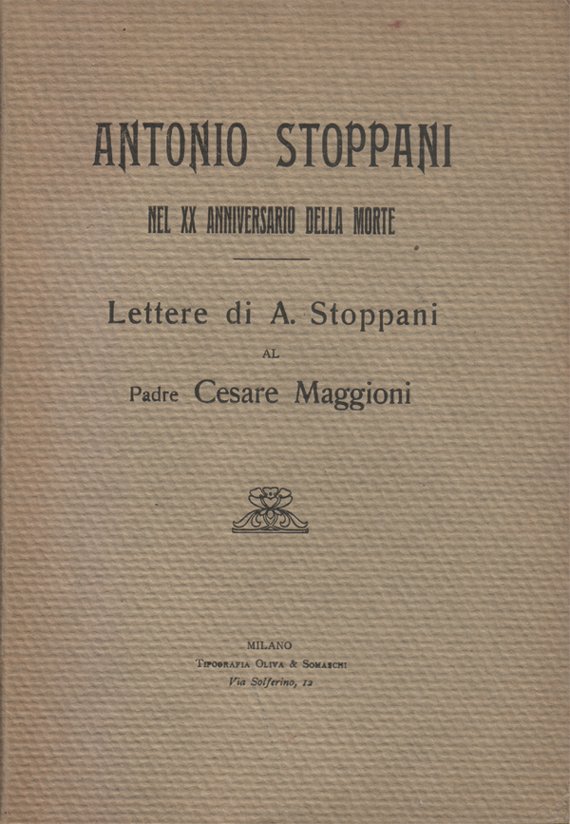 In-8° (cm 24,2x16,7), pp. 153, (3), copertina in cartoncino editoriale con titoli in nero alla copertina anteriore. Con cinque tavole fuori testo di illustrazioni in bianco e nero. In ottimo stato. Sommario: Antonio Stoppani [biografia, n.d.c.]; Il Padre Cesare Maggioni; L'ab. A. Stoppani al P. C. Maggioni - Lettere; Lettera di A. Stoppani al Cardinale Alimonda; Sulle Cinque giornate - Lettera dell'Ab. A. Stoppani al Conte L. Torelli; Lettera di A. Stoppani al Rosminiano Prof. Calza; Lìamore di Antonio Stoppani al paese nativo.