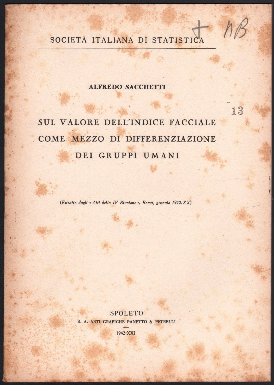 SUL VALORE DELL'INDICE FACCIALE COME MEZZO DI DIFFERENZIAZIONE DEI GRUPPI UMANI ESTRATTO DEGLI ATTI DELLA IV RIUNIONE ROMA GENNAIO 1942 ALFREDO SACCHETTI SPOLETO 1942 PP. 12 CM. 24 X 17. L 5606 RARO ESTRATTO DI 12 PAGINE LEGATURA EDITORIALE MORBIDA, CON FIORITURE PAGINE INTERNE IN BUONE CONDIZIONI, CON LEGGERE FIORITURE ALLA PRIMA ED ULTIMA PAGINA. NUMERO CON TIMBRO ALLA PRIMA DI COPERTINA IN ALTO A DESTRA.