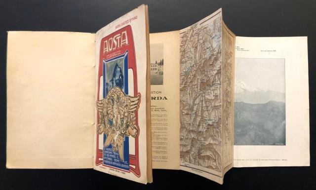 Librairie Brivio, Aoste, 1910 – 1911. Guides Illustrés Reynaud. Chemin de Fer de l’État. Club Alpin Italien (Section d’Aoste). Genes, Imprimerie G. A. Armanino. In 8vo, front. illustrato a piena pagina in colore rosso, blu e oro, firmata R. Ceradini, varie pp. pubblicitarie anche illustrate, segue 1 cartina della regione in colore più volte ripiegata, pp. 243 numerate (con la Table des Matières e l’Index Alpabétique) + varie pubblicitarie in fine, anche illustrate (le pubblicità a inizio volume sono relative alla navigazione sui vari laghi italiani e di confine: Lemano, Annecy, Maggiore, Lugano, il lago di di Como e di Garda, sono illustrati con belle vedute delle località e dei piroscafi; le publicità in fine sono relative alle strutture alberghiere della regione: tra queste Courmayeur, Cogne e Gressoney), molte sono le ill. fot. in b/n n. t. relative a scorci cittadini, paesistici e ghiacciai + è presente 1 tavola più volte ripiegata “Le Mont Cervin et la Chaine du Mont Rose”, con indicate tutte le cime di quel gruppo di monti, bross. non originale in tutta percallina verde muta. Alla prima bianca firma coeva e autografa di appartenenza di Dario Lupi (1876 – 1932) avvocato e deputato toscano, sottosegretario all’istruzione pubblica nel governo Mussolini. Allentato e con alcuni difetti di scollatura al dorso ma in buono stato tutto il volume. .