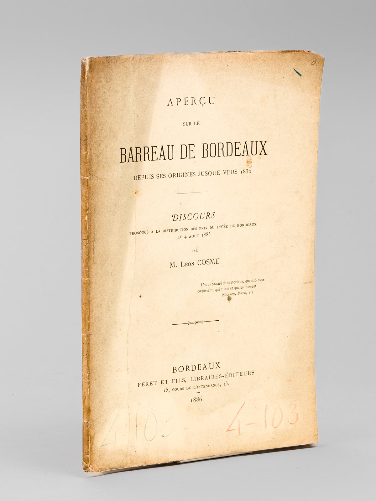 Aperçu sur le Barreau depuis ses origines jusque vers 1830. Discours prononcé à la distribution des Prix du Lycée de Bordeaux le 4 août 1885 [ Livre dédicacé par l'auteur ]