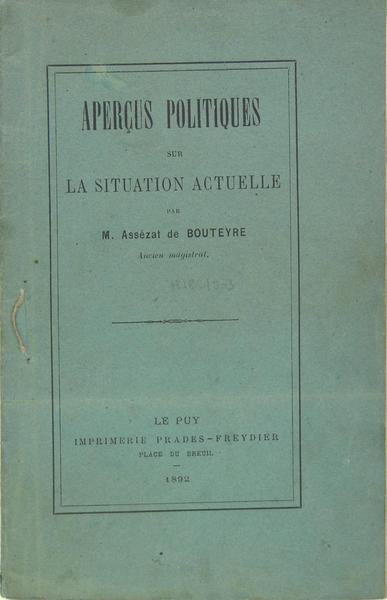Le Puy, imprimerie Prades Freydier, 1892. Plaquette in-2 (19 x 12 cm) cahier cousu, couverture imprimée, 35 pages. Avec un envoi de l'auteur (ancien magistrat) pour Charles Calemard de La Fayette (1815-1901) en page de titre.