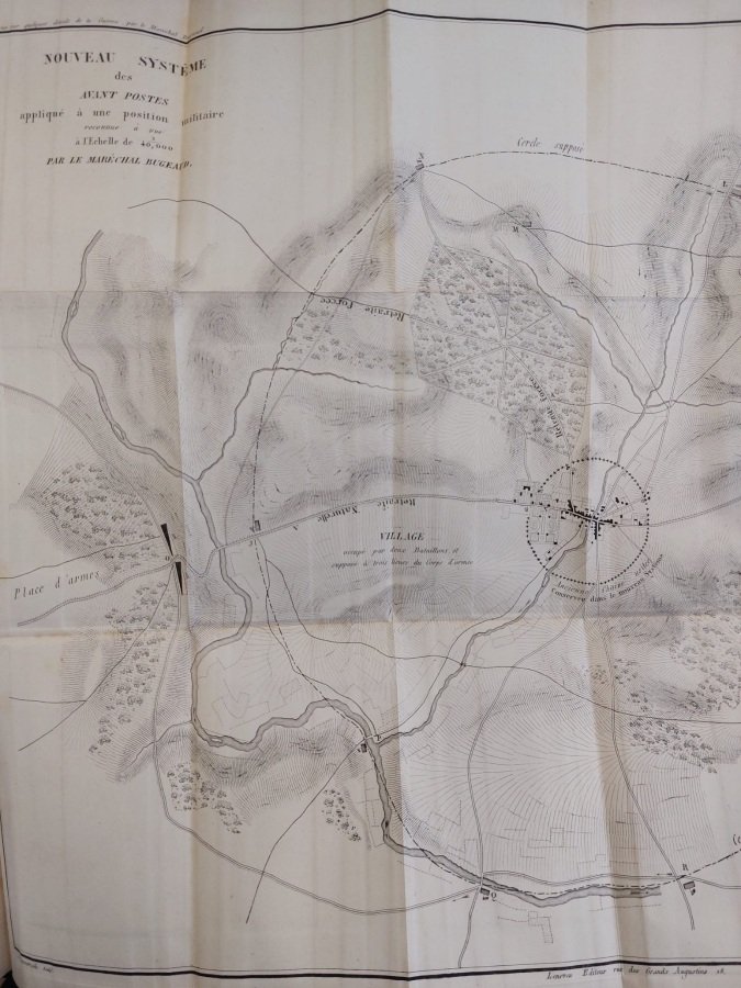 In-24° (cm. 12,1), legatura coeva in mezza pelle con titolo, filetti e fregi in oro al dorso (lievi abrasioni ai piatti), tagli spruzzati blu; pp. XVI 172 in buono stato (lievi fioriture sparse). Terza edizione; con 4 grandi tavole più volte ripiegate fuori testo in fine. Importante trattato del celebre Maresciallo Bugeaud, conquistatore dell'Algeria. Non comune. Esemplare molto buono. (NQ6)