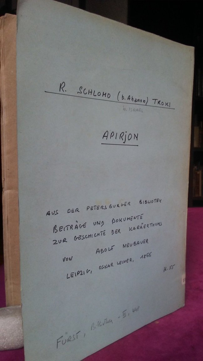 Volume in 8, falsa brossura, titolo manoscritto al piatto, con nota (Aus der Peters Burger Bibliotek Beitrage und dokumente zur Geschichte der Karaerthums von A. N.), frontespizio, 32 cc., testo completamente in lingua ebraica. Raro ed interessante estratto, in ottimo stato di conservazione.