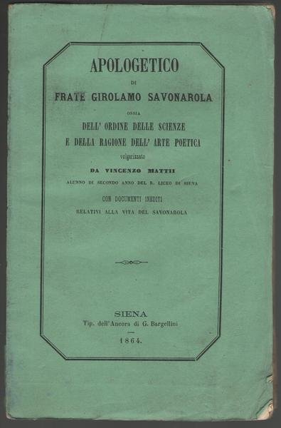 APOLOGETICO DI FRATE GIOVANNI SAVONAROLA OSSIA DELL'ORDINE DELLE SCIENZE E DELLA RAGIONE DELL'ARTE POETICA volgarizzato DA VINCENZO MATTII ALUNNO DI SECONDO ANNO DEL R. LICEO DI SIENA. CON DOCUMENTI INEDITI RELATIVI ALLA VITA DEL SAVONAROLA.
