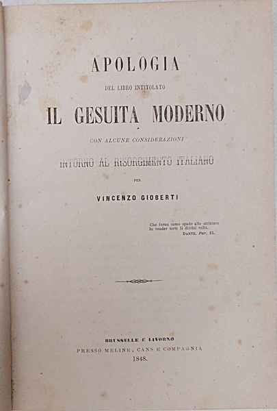 Apologia del libro intitolato Il Gesuita Moderno con alcune considerazoioni intorno al Risorgimento Italiano.