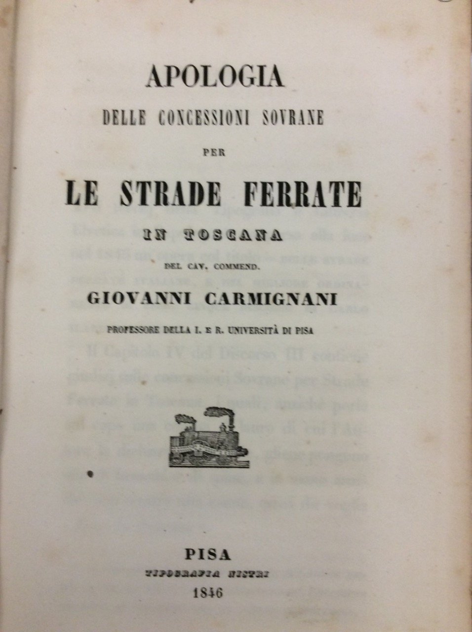 In-8 p. (mm. 214x133), brossura muta moderna, pp. 94,(2). In Appendice al § II. (Della strada per deserti, e mal'aria): Sulla nuova strada ferrata maremmana. Lettera di Francesco Puccinotti al Ch. Cav. Commendatore Giovanni Carmignani. L'A., professore all'Università di Pisa, con questo lavoro intende confutare i giudizi negativi sulle strade ferrate della Toscana, contenuti in un'opera di Carlo Petitti Delle strade ferrate italiane, e del miglior ordinamento di esse (pubblicata nel 1845 a Capolago). Solo qualche lieve fiorit. altrimenti ben conservato.