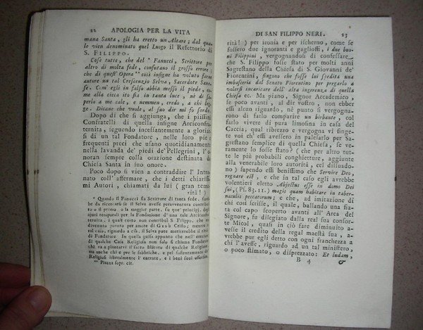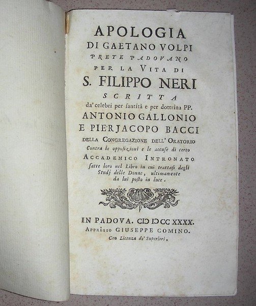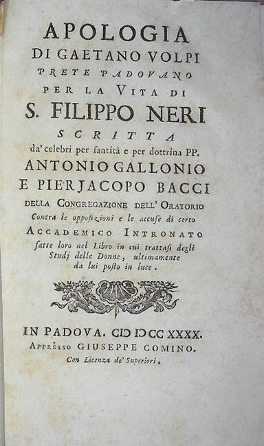 APOLOGIA di. Prete Padovano per la vita di S. Filippo Neri scritta da' celebri per santità e dottrina PP. Antonio Gallonio e Pier Jacopo Bacci della Congregazione dell'Oratorio. Contra le opposizioni e le accuse di certo Accademico Intronato fatte loro nel libro in cui trattasi degli studi delle donne, ultimamente da lui posto in luce.