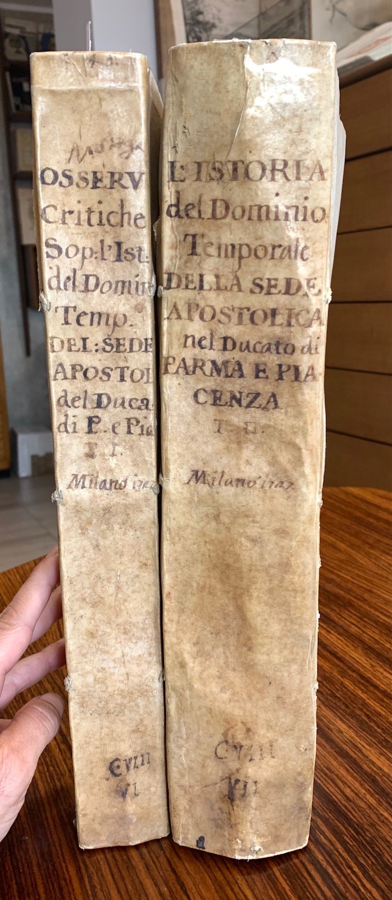 >in-folio (mm 355x235), tre parti in 2 volumi, pp. (24), 512, 1 foglio di errata, 1 c.b.; (8), 267, 1 foglio di errata, 1 c.b.; (8), 538, 1 c.b. e 1 foglio di errata. Ognuna delle 3 parti possiede autonomo frontespizio fregiato da stemma calcografico, due incisioni calcografiche nel testo raffiguranti monete. Legatura coeva in mezza pergamena con titolo manoscritto al dorso, piatti in cartonatura rustica. Prima e unica rara edizione di questa relazione di carattere storico-giuridico, contenente preziose informazioni su Parma e Piacenza. Opera nata sull'onda delle polemiche circa la sovranità di Parma e Piacenza, che all'epoca diventò un vero e proprio caso: la battaglia giurisdizionalistica in Italia si inasprì in particolare con la restituzione di Comacchio al Pontefice (20 febbr. 1725) precedentemente occupata dall'Impero nel 1708, e con la vertenza, appunto, intorno a Parma e Piacenza. Al contropiatto superiore Ex-libris inciso tardo settecentesco - con stemma marchionale della panoplia con lo scudo con al centro una stella - della famiglia Dionisi, tra le più antiche della nobiltà di Verona. Bellissimo e fresco esemplare con ampi margini ed in barbe. Lozzi 3364; Melzi I, 76.