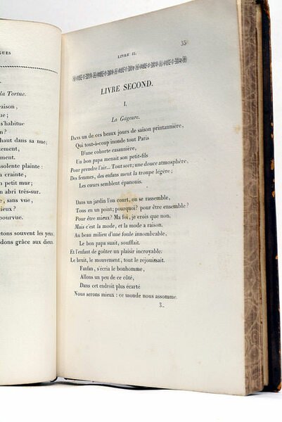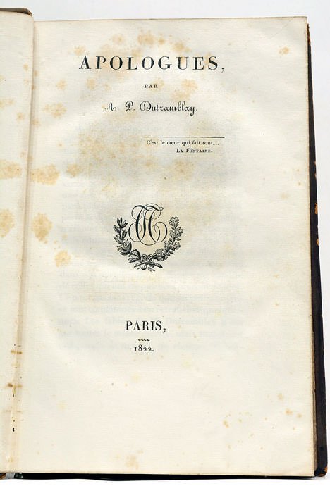 Portrait. XXVII. 184 pages. (21,5x13,5 Cm). Plein veau. Dos lisse orné. Filet doré d'encadrement sur les plats. Coins et coiffes émoussés. Plats légèrement frottés. Rousseurs. Une coiffe et charnières abîmées. Recueil de fables dont plusieurs concernent la gastronomie: l'enfant et les confitures, le cerisier, l'orange, le pommier dépouillé, la carpe et le goujon, les perdreaux, les deux melons, etc. Un avertissement placé en tête du volume indique que cette nouvelle édition donnée par les enfants de l'auteur était "exclusivement réservée aux amis et à la famille de M. Dutramblay". Dédicace manuscrite ancienne sur un feuillet de garde: "Hommage a son amie Madame Caroline Gerard par le fils de l'auteur".