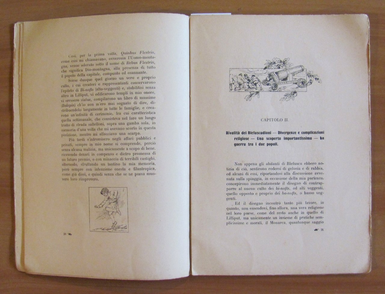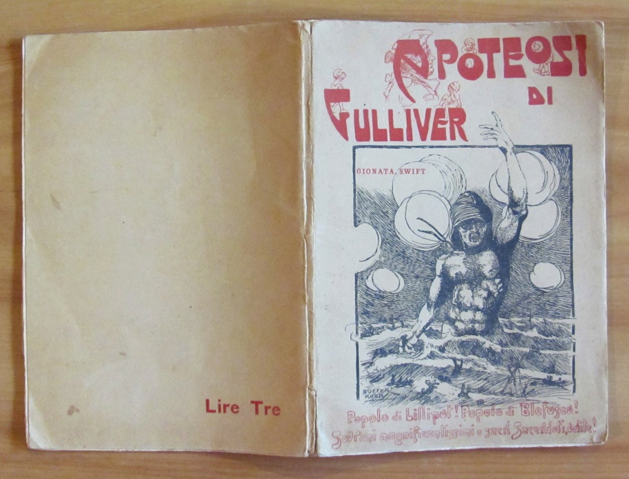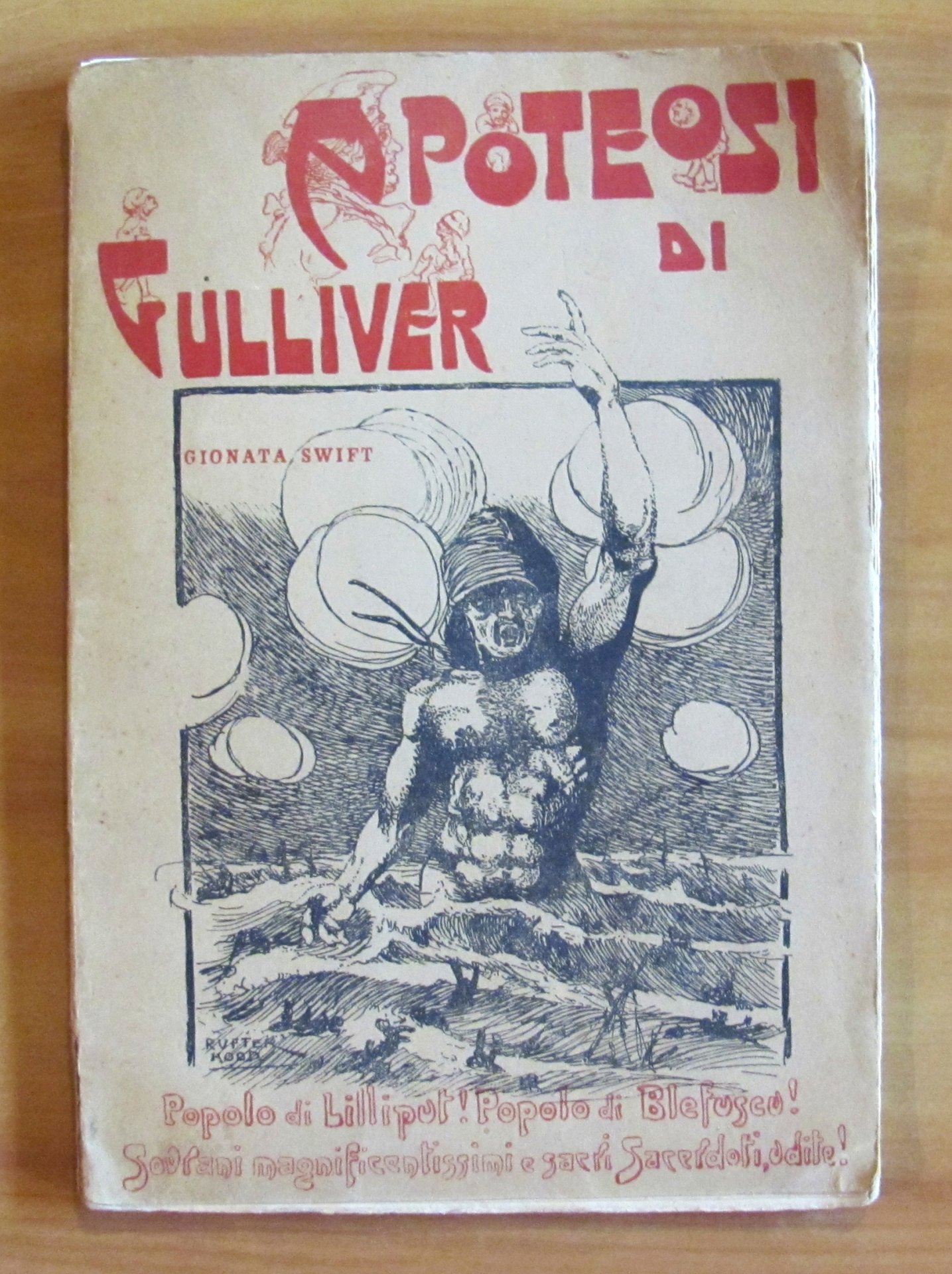 Popolo di Lilliput! Popolo di Blefuscu! Sovrani magnificentissimi e sacri Sacerdoti, udite! Bella copertina in b/n, testatine, finalini e 4 tavole in b/n f.t. di Rufter Hood. Società Editrice Avanti - Milano, 1920. Prima versione italiana di G. G. (Giuseppe Giusta). Brossura editoriale con minima imperfezione in basso alla cerniea anteriore, peraltro libro freschissimo e pulito. 17x24,5; pp.63. Raro e in Ottimo stato. , Ottimo (Fine)