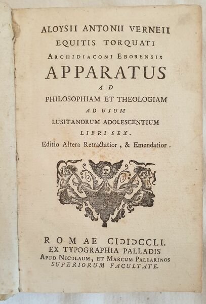 Edizione del 1751di questa opera contenente nozioni di filosofia e teologia ad uso della gioventu scritta dal pedagogo portoghese Luis Antonio Verney (1713-1792). All'interno: storia della filosofia, utilità della filosofia, celebri filosofi (Platone, Aristotele, Epicuro, Padri della Chiesa), storia della teologia, natura e uso della teologia, celebri autori di teologia ecc. In buone condizioni. Copertina in piena pergamena coeva con titolo in oro al dorso in discrete condizioni con usure ai margini e dorso. Legatura in buone condizioni. Pagine in buone condizioni con fioriture. Rottura al contropiatto anteriore. L'ultima carta bianca assente. In 8. cm. 20x13. Pp. XXIII+(1)+534. Edition of 1751 of this work containing notions of philosophy and theology written by the portoguese pedagogist Luis Antonio Verney (1713-1792). inside: history of philosophy, famous philosophers (Platone, Aristotele, Epicuro, Padri della Chiesa), history of theology, nature and usage of theology, famous authors of theology ecc. In good conditions. Full parchment coeval cover with golden title in the spine in fair conditions with wearings in the extremities. Binding in good conditions. Pages in good conditions with foxings. Crack in the front counterplate. Last blank page is loss. In 8. cm. 20x13. Pp. XXIII+(1)+534.