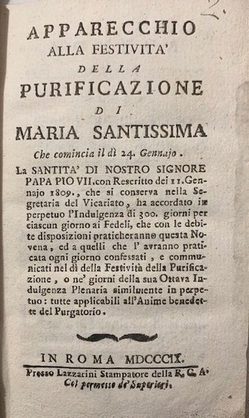 Apparecchio alla Festività della purificazione di Maria Santissima, Che comincia il dì 24. Gennajo. La Santità di Nostro Signore Papa Pio VII. con Rescritto dei 11. Gennajo 1809, che si conserva nella Segreteria del Vicariato, ha accordato in