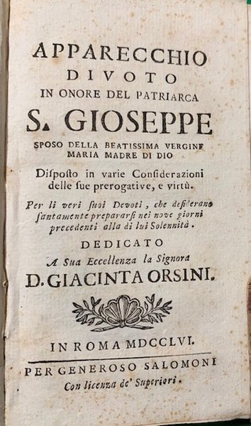 In 12°; 71, (1) pp. Senza brossura ma non slegato. Tagli spruzzati in rosso. Devizionalia dedicato alla figura di San Giuseppe. L'opera è dedicata a Giacinta Orsini. Esemplare in buone condizioni di conservazione.
