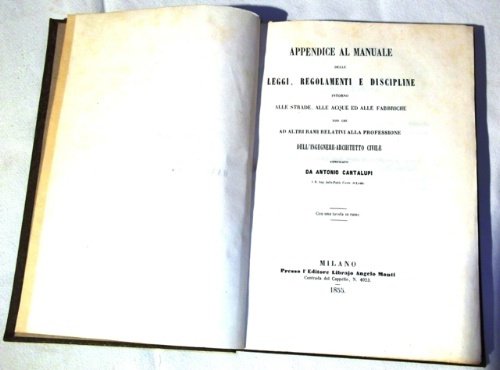 Appendice al manuale delle leggi, regolamenti e discipline intorno alle strade, alle acque ed alle fabbriche non che [sic] ad altri rami relativi alla professione dell’ingegnere-architetto civile compilato da Antonio Cantalupi I.R. Ing. della Pubb. Costr.'www.libr Con una tavola in rame.