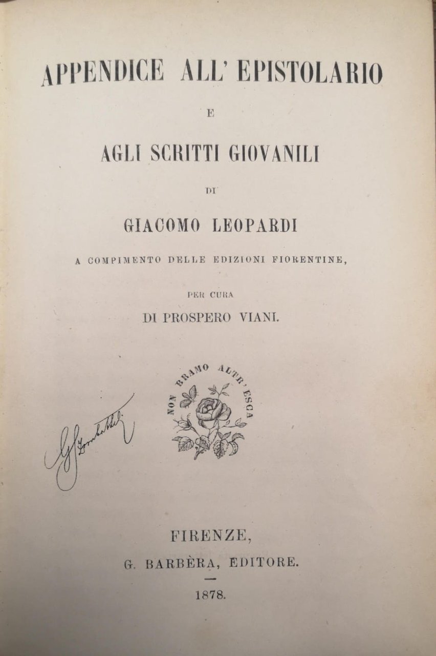 APPENDICE ALL'EPISTOLARIO E AGLI SCRITTI GIOVANILI DI GIACOMO LEOPARDI. - A compimento delle edizioni fiorentine. Per cura di Prospero Viani.