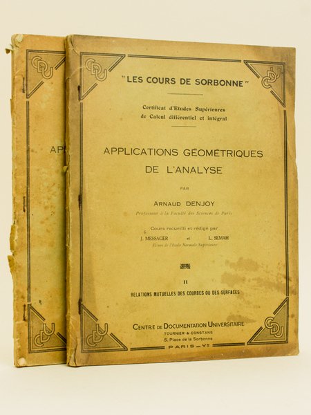 Cours recueillis par J. Messager et L. Semah, Elèves de l'Ecole Normale Supérieure, 2 vol. in-4 br., Les Cours de Sorbonne, Certificat d'Etudes Supérieures de Calcul différentiel et intégral, Centre de Documentation Universitaire, Tournier & Constans, Paris, s.d. (circa 1936-1938), 118 pp. (pagination continue) Exemplaire portant au verso du premier feuillet la signature d'Arnaud Denjoy, à titre de "signature confirmant le privilège de l'auteur". Rare exemplaire de ce cours, provenant (avec quelques annotations et compléments) de la bibliothèque de L. Sémah, l'un des deux normaliens ayant mis en forme le cours de Denjoy. Etat satisfaisant (dos abîmés couv. frottée, bon état avec annotations de Lucien Sémah).