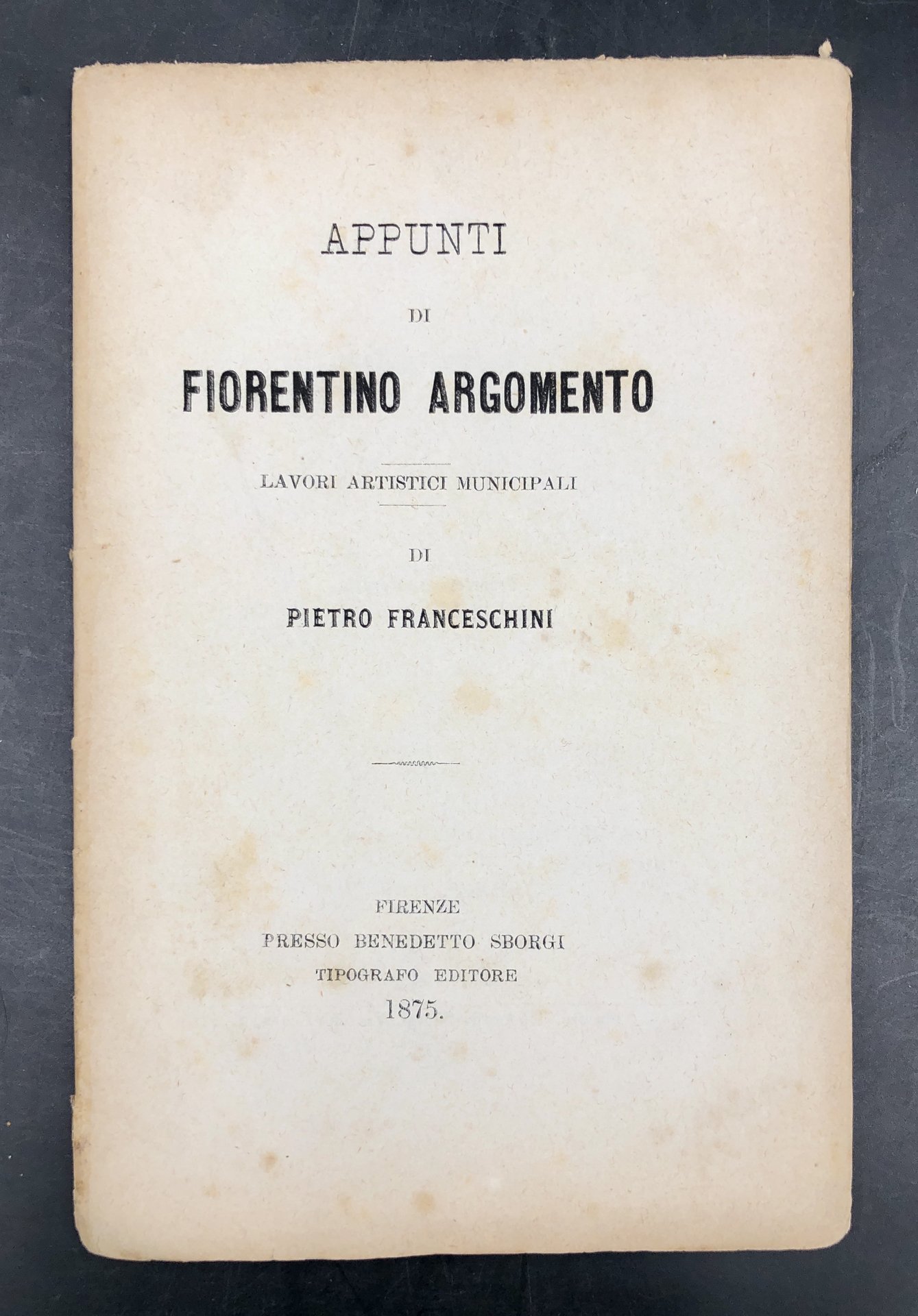 In-16° grande (cm. 19,2x12,5), pp. 64. Fasc. imbastito, privo di copertine. Dedica a stampa a Filippo BANI. Contiene vari scritti apparsi sulla Gazzetta d'Italia, dal 1870 in poi: 1) Retrospettiva dei Lavori Municipali. 18 pp. Dedicato all'arch. John Temple, restauratore del Castello di Vincigliata. 2) I restauri del Palazzo SPINI. 4 pp. 3) I DIPINTI della Cappella PORTINARI. 7 pp. 4) Il collocamento del nuovo Monumento al Savonarola. 5 pp. 5) Il reclamo delle OSSA del POLIZIANO. 3 pp, 6) SCAVI di via De' GONDI. 8 pp. 7) La CASA di DANTE. 6 pp. 8) La FACCIATA del DUOMO. 6 pp. 8) Acune Epigrafi. FRANCESCHINI si occupò più volte di restauri fiorentini, delle statue per la Loggia del Mercato Nuovo ecc., ma non sempre fu ascoltato. Rarissimo.