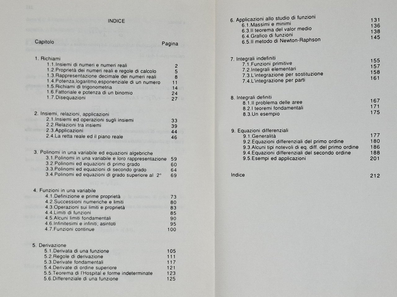 Università di torino. Corso di laurea in scienze agrarie, corso di laurea in scienze forestali. Anno accademico 1993-1994. Pagine: 213. Formato: 17 x 24 cm circa. Stato di conservazione: decisamente buono. privo di scritte, annotazioni, sottolineature o altri segni nel testo. Copertina editoriale flessibile. Con figure in nero nel testo. Indice dei grandi capitoli: 1- Richiami, 2- Insiemi, relazioni, applicazioni, 3- Polinomi in una variabile ed equazioni algebriche, 4- Funzioni in una variabile, 5- Derivazione, 6-Applicazione allo studio di funzioni, 7- Integrali indefiniti, 8- Integrali definiti, 9- Equazioni differenziali.