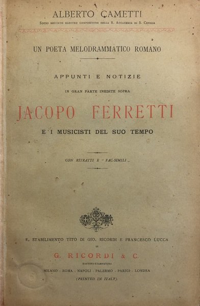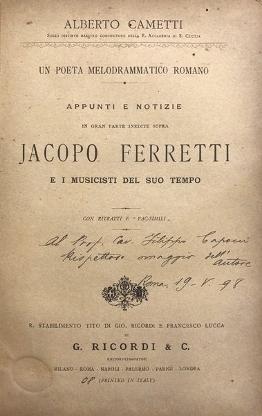Legatura in mezza tela con piatti cartonati e tassello al dorso, pp 269, con ritratto del poeta melodrammatico romano in antiporta. Dedica dell'autore sul frontespizio